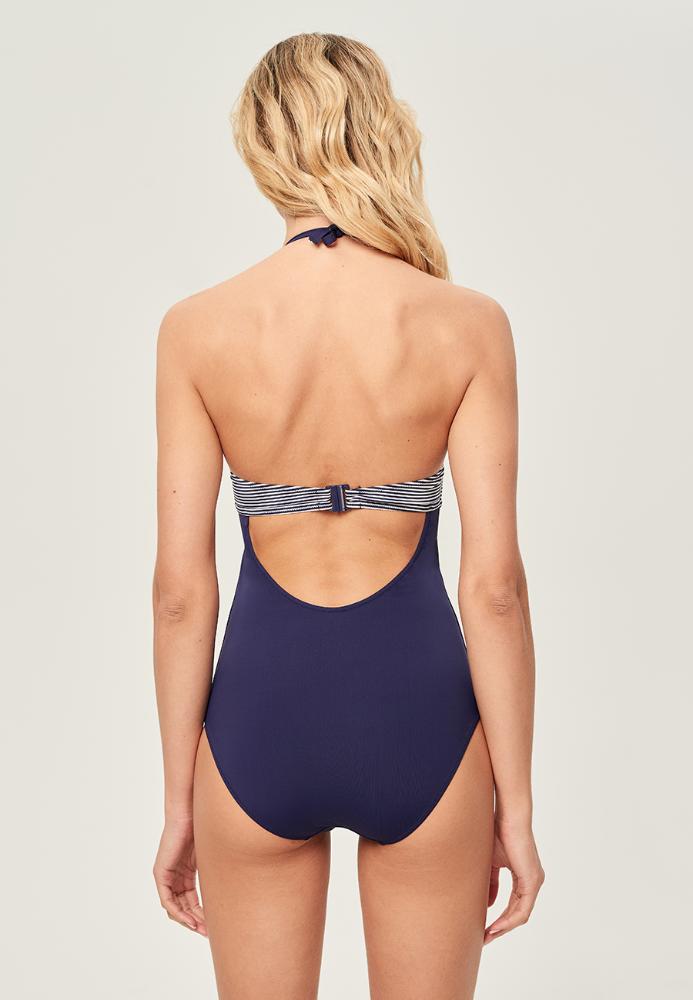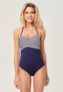 Женственный слитный купальник. Оригинальный лиф в классическую морскую полоску имеет формованную чашку и косточки. Съемные бретели завязываются за шеей. Боковые корсетные вставки улучшают посадку. На спинке полукруглый вырез и удобная пластиковая застёжка.