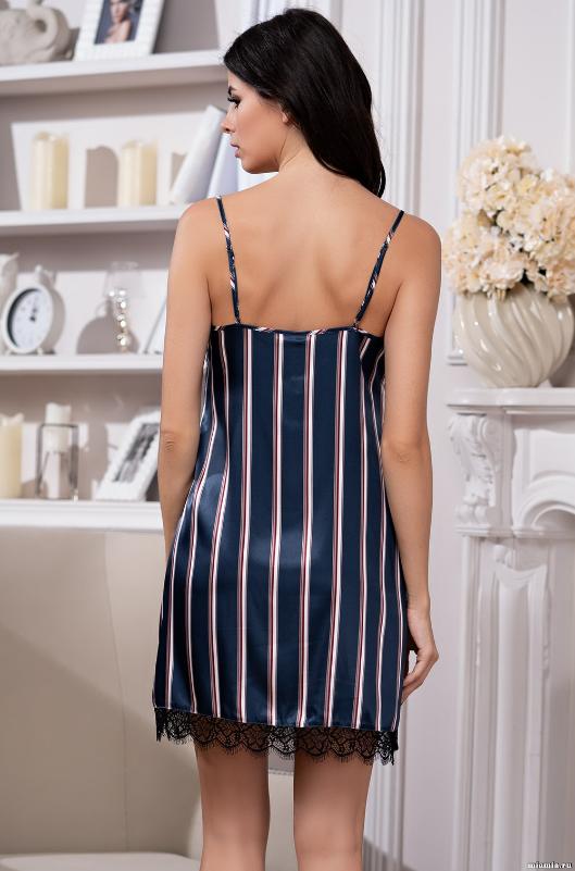 Короткая сорочка Mia-Amore из искусственного принтованного шелка в полоску, на тонких бретелях. Верх декольте и низ изделия изящно декорированы кружевом. Сорочка украшена элегантным черным бантиком с подвеской в виде кристалла.<br />