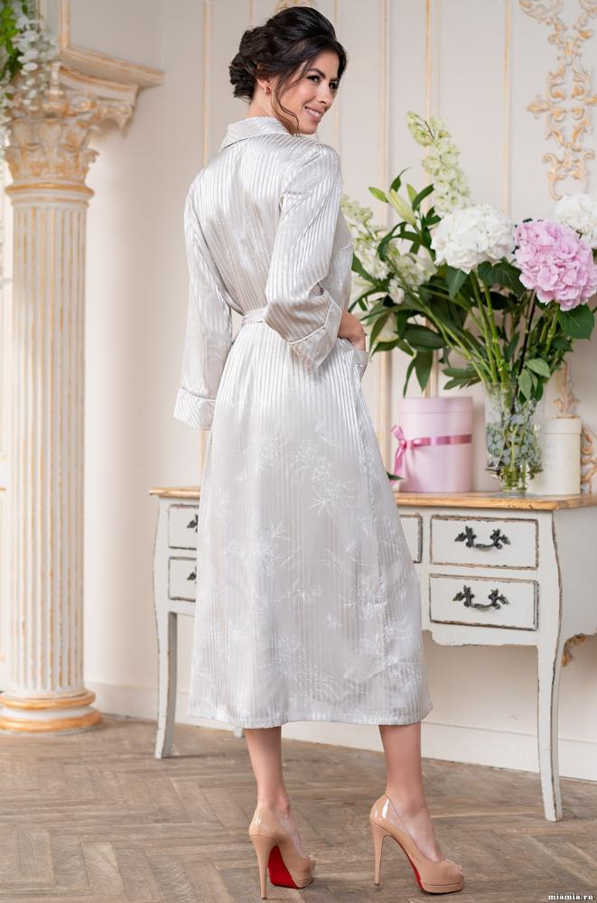 Длинный халат Mia-Amore с центральной застежкой на пуговицы выполнен из искусственного принтованного жаккардового полотна. Перед халата декорирован парой кармашков на уровне бедер. Воротник, рукава и карман декорированы тонким кантом. По талии ширина халата регулируется поясом.<br />