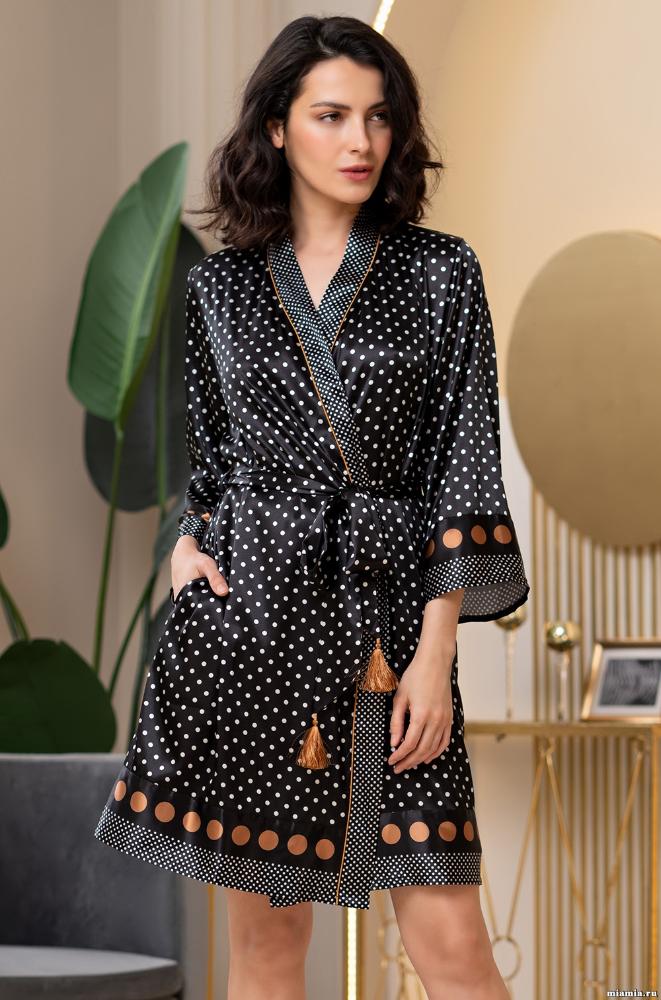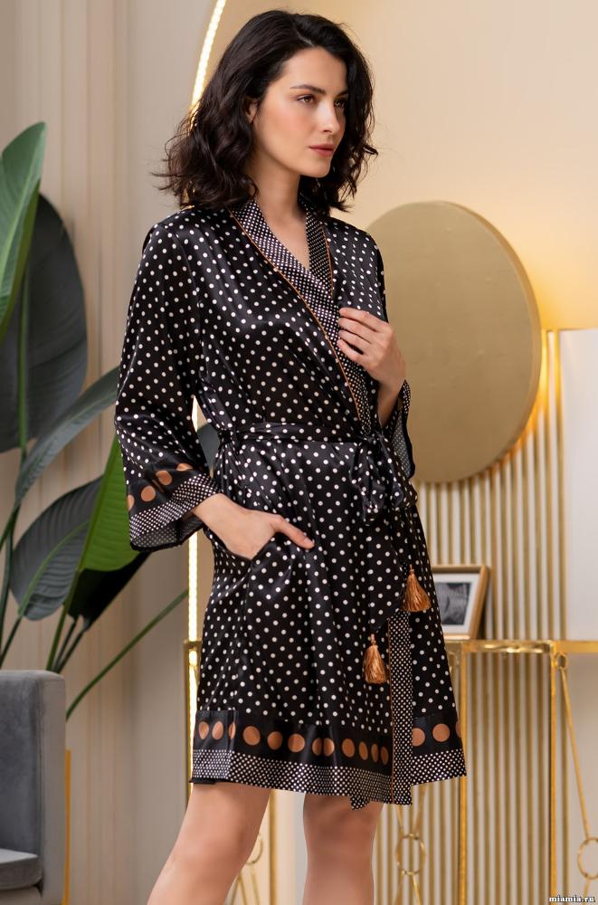 Короткий запашной халат Mia-Amore с рукавом ¾, выполнен из искусственного шелка с купонным принтом. Бронзовый кант расположен вдоль бортов халата. В боковых швах обработаны карманы. Концы пояса декорированы кисточками.<br />
