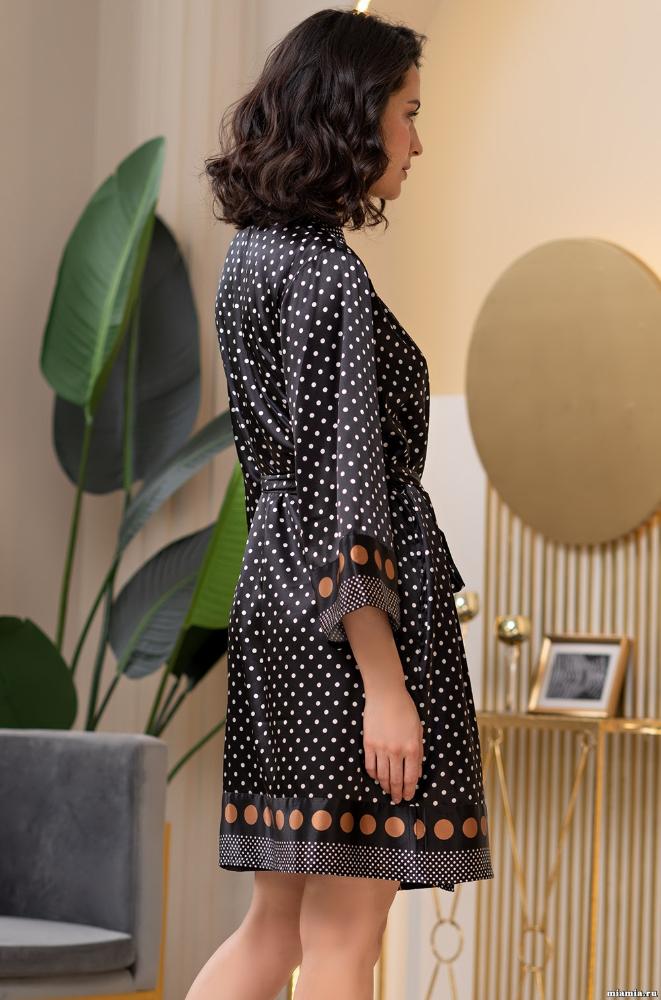 Короткий запашной халат Mia-Amore с рукавом ¾, выполнен из искусственного шелка с купонным принтом. Бронзовый кант расположен вдоль бортов халата. В боковых швах обработаны карманы. Концы пояса декорированы кисточками.