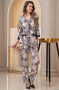 Комплект Mia-Amore состоит из жакета с центральной застежкой на пуговицы и брюк, выполнен из принтованного вискозного полотна. Рукава по низу и карманы жакета оформлены ажурным черным кружевом, повторяющим мотивы основного принта на ткани. Боковой шов брюк и планка жакета декорированы тонким черным кантиком.