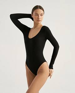 Женский облегающий боди. Втачной длинный рукав. Вырез круглый. Застежка в паховой части на крючки.