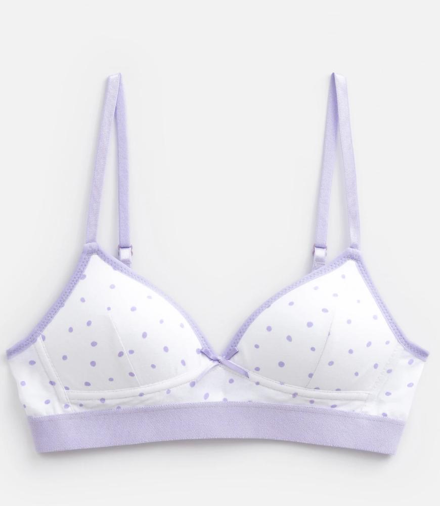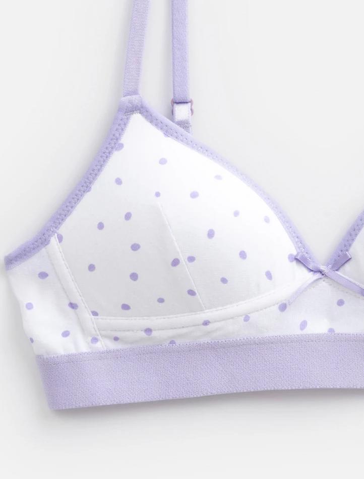 Бюстгальтер выполнен в нежной расцветке в сиреневый горошек и украшен нежным атласным бантиком. Акцент модели – жаккардовая резинка, которая привносит нотку спорта в девичий образ.<br />