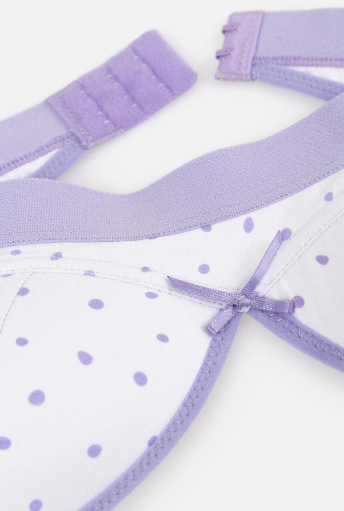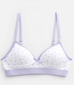 Бюстгальтер выполнен в нежной расцветке в сиреневый горошек и украшен нежным атласным бантиком. Акцент модели – жаккардовая резинка, которая привносит нотку спорта в девичий образ.