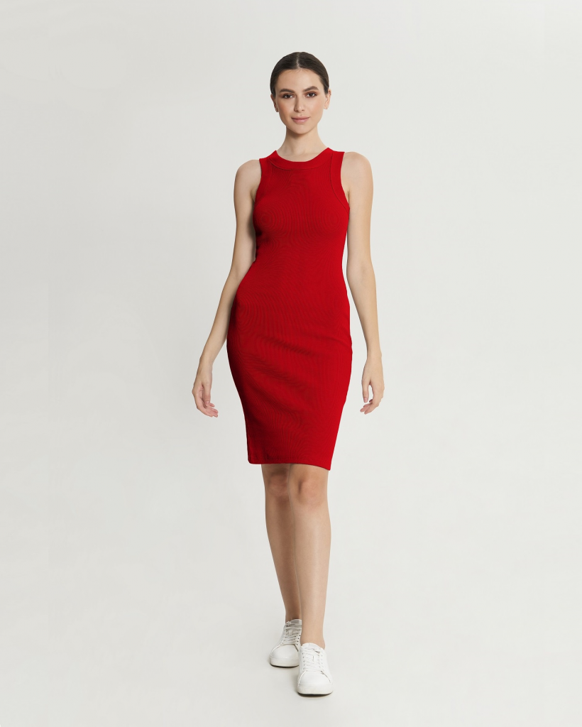 Платье средней длины из кашкорсе, облегающего силуэта, с широкой окантовкой пройм и горловины из рибаны.