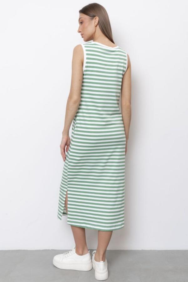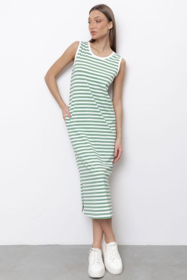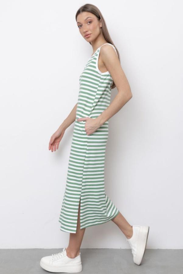 Женское летнее платье-футболка из эластичного трикотажного полотна с узором в полоску создаст готовый комфортный образ для жаркой погоды на каждый день. Данная модель имеет свободный прямой силуэт со спущенной линией плеча и короткими рукавами. Платье с карманами а боковых швах. Платье с круглым вырезом будет отлично сочетаться с открытой летней или спортивной обувью и с подходящими аксессуарами.